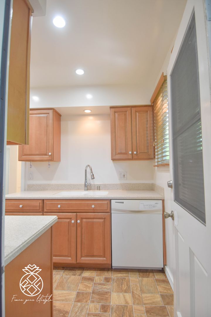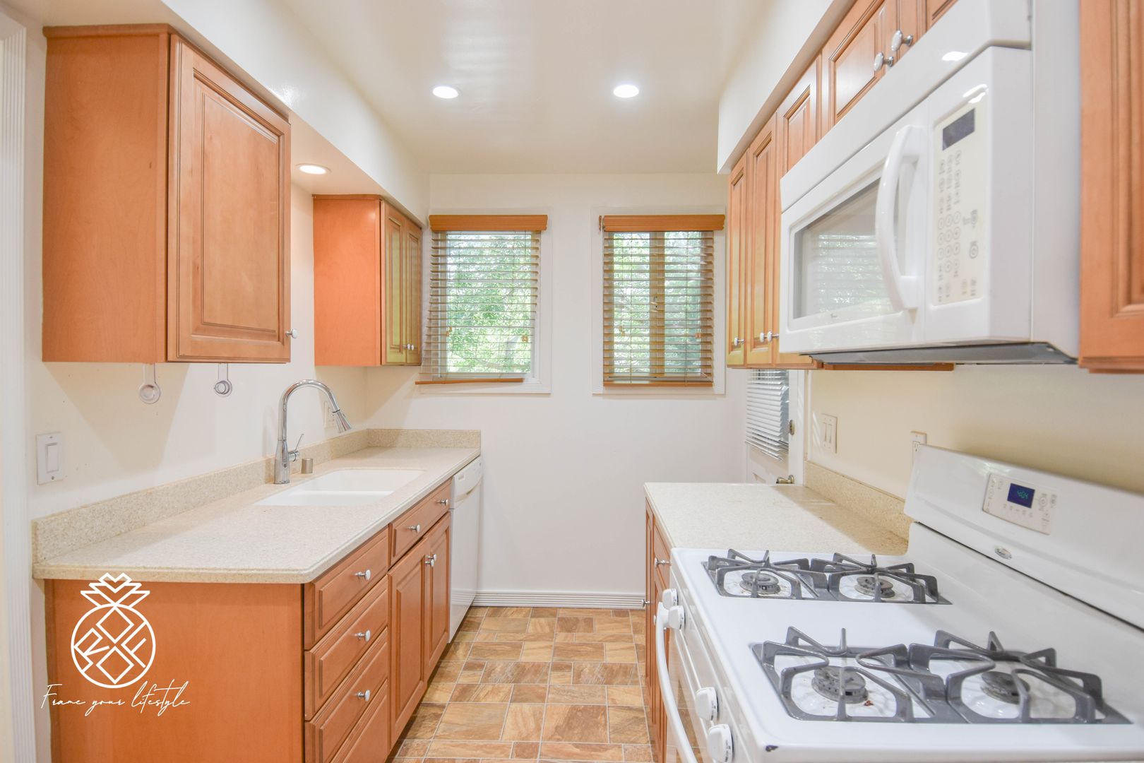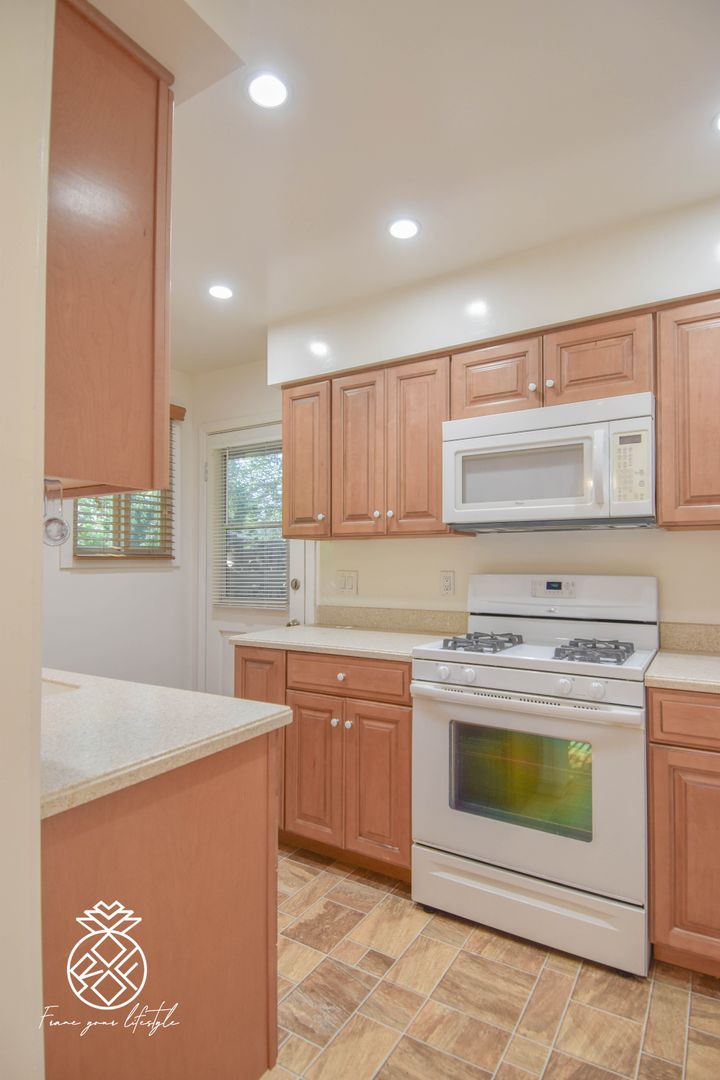 - Gourmet kitchen includes custom cabinets, stone countertops, stainless steel appliances (microwave range hood & refrigerator) + dishwasher